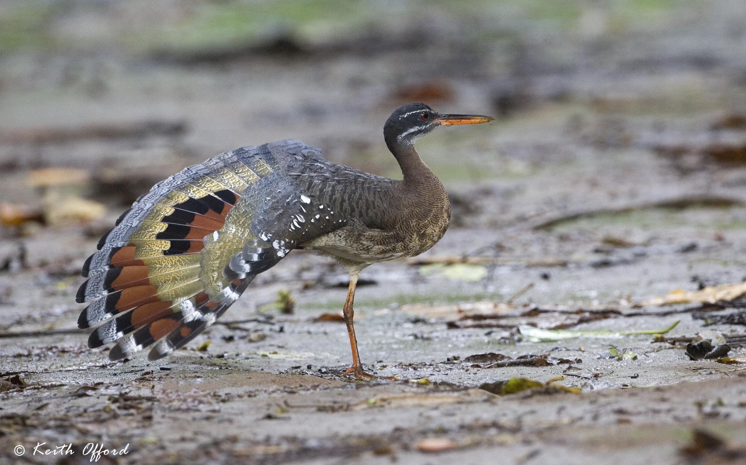 It had rained overnight and this Sunbittern was looking for frogs along riverside tracks, early in the morning. I had managed to position myself so it was walking toward me and this was the moment I had been waiting for - a full wing-stretch showing the incredible colours.
